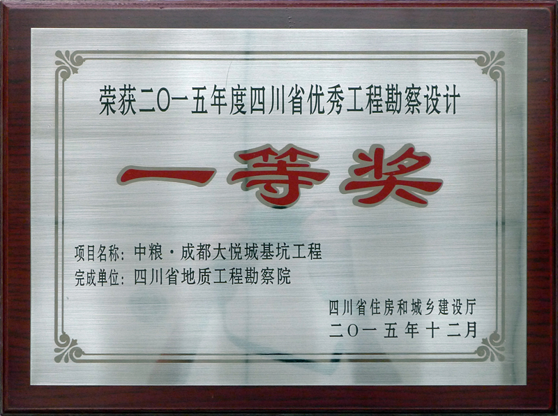 國道213、317線都江堰至汶川公路廟子坪岷江特大橋詳細勘察階段工程地質(zhì)勘察項目獲得全國優(yōu)秀工程勘察設計行業(yè)獎二等獎,成都水文隊生產(chǎn)科研用房和經(jīng)濟適用房(5幢綜合樓)水源熱泵中央空調(diào)工程水文地質(zhì)勘察、中糧·成都大悅城基坑工程獲得省工程勘察設計“四優(yōu)”一等獎,歐尚購物中心工程勘察、松潘縣川主寺鎮(zhèn)第二自來水廠水源地綜合水文地質(zhì)勘察報告(山巴——川盤橋段)獲得省工程勘察設計“四優(yōu)”二等獎,潤慶·山予城一期巖土工程勘察報告獲省工程勘察設計“四優(yōu)”三等獎。